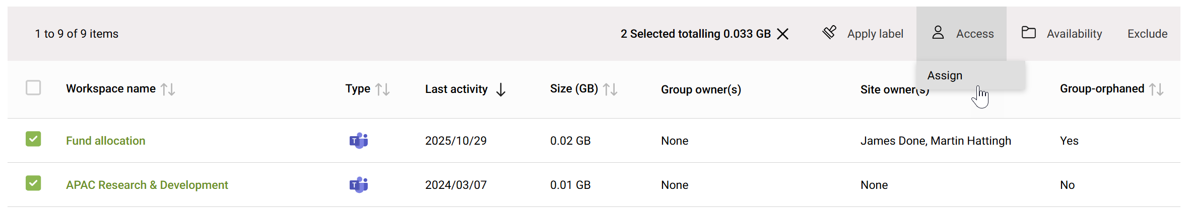For any orphaned sites, you can easily assign ownership in bulk.
