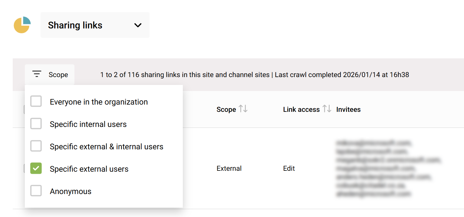 Sharing link reports are available within each site. It shows every file or folder that’s shared, the type of link (Anyone, People in org, Specific people), who created the link, and who it was shared with. This data is for all time, and not only for the last 28 days. This is gold for security reviews: you can, for example, filter to see all anonymous shares in a site. In addition to the DAG functionality, you can also remove them if they’re not needed, with only a few clicks.