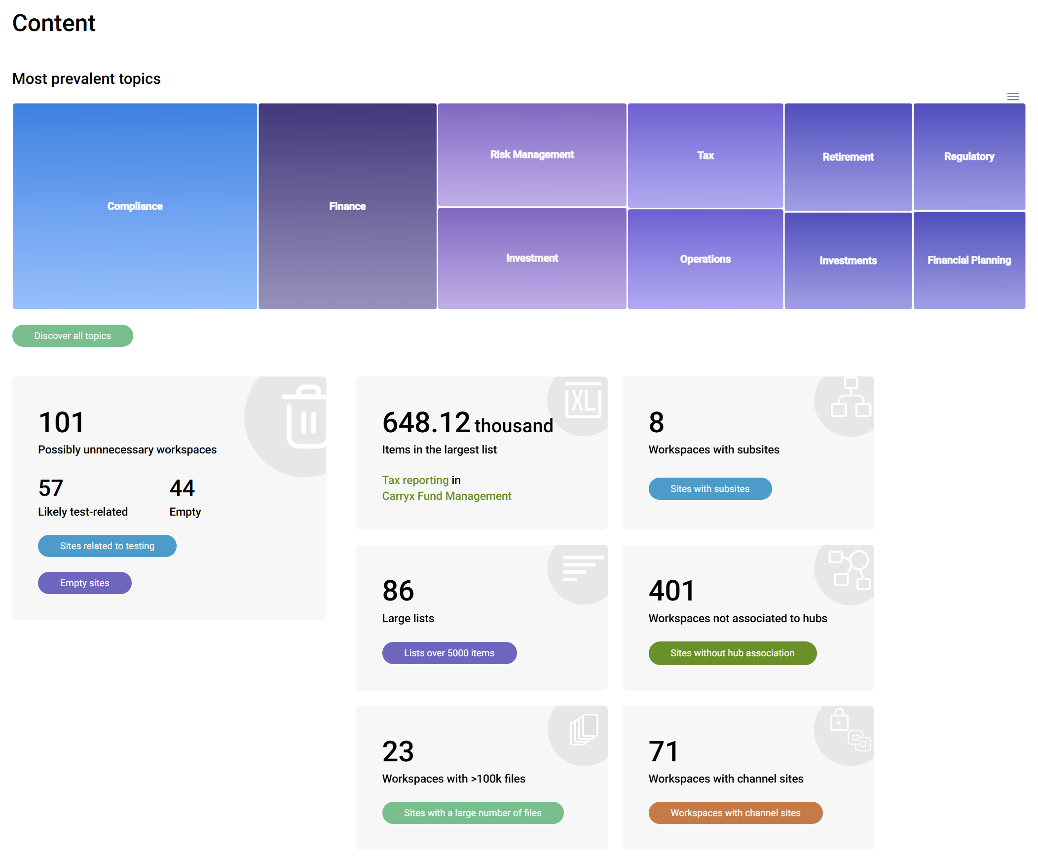 The Content section of Health Check is all about understanding the composition of your SharePoint data and the structure of your tenant. It addresses a range of content governance questions.