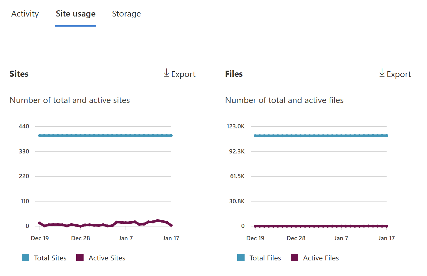 - The Microsoft 365 Admin Center offers tenant-wide usage reports (files, active sites, storage) up to 180 days.