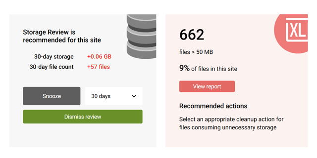 Clean up large filesUse the large file report to find content which may be taking up unnecessary storage due to size or an excessive number of versions.