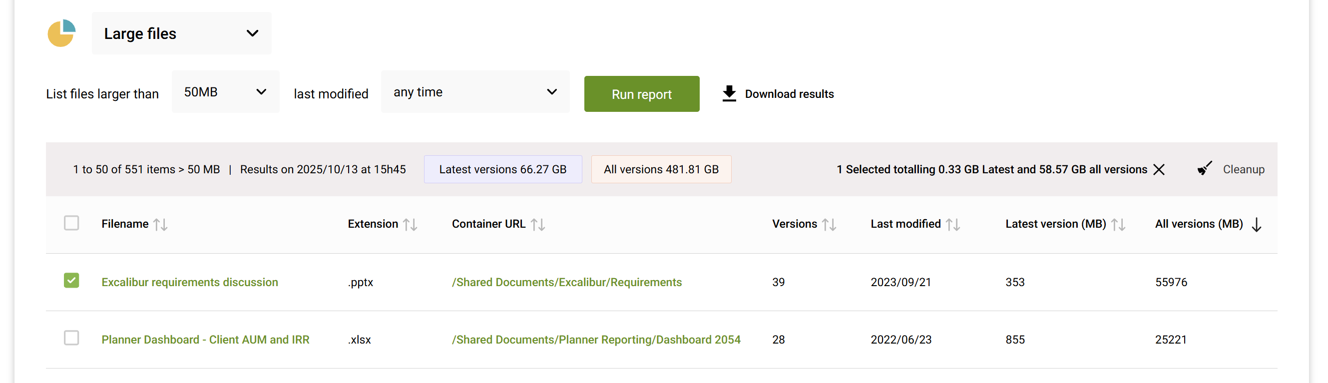SProbot's large file report with version cleanup enables you to review and choose to trim unnecessary older versions of large files, or entirely delete large files which are obsolete or do not belong in SharePoint in the first place. Using the cleanup tool enables you to save on storage quickly and efficiently.
