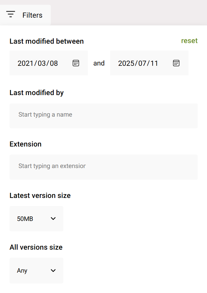 If you are looking for specific files you suspect might be present, you can search within these results, or filter to people, extensions, or size thresholds.