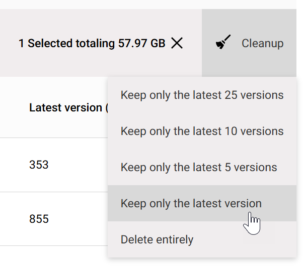In our example, keeping only the latest version of Excalibur requirements discussion.pptx will save just over 58GB of storage (all versions total of 59364MB minus latest version 353MB = 57.62GB).