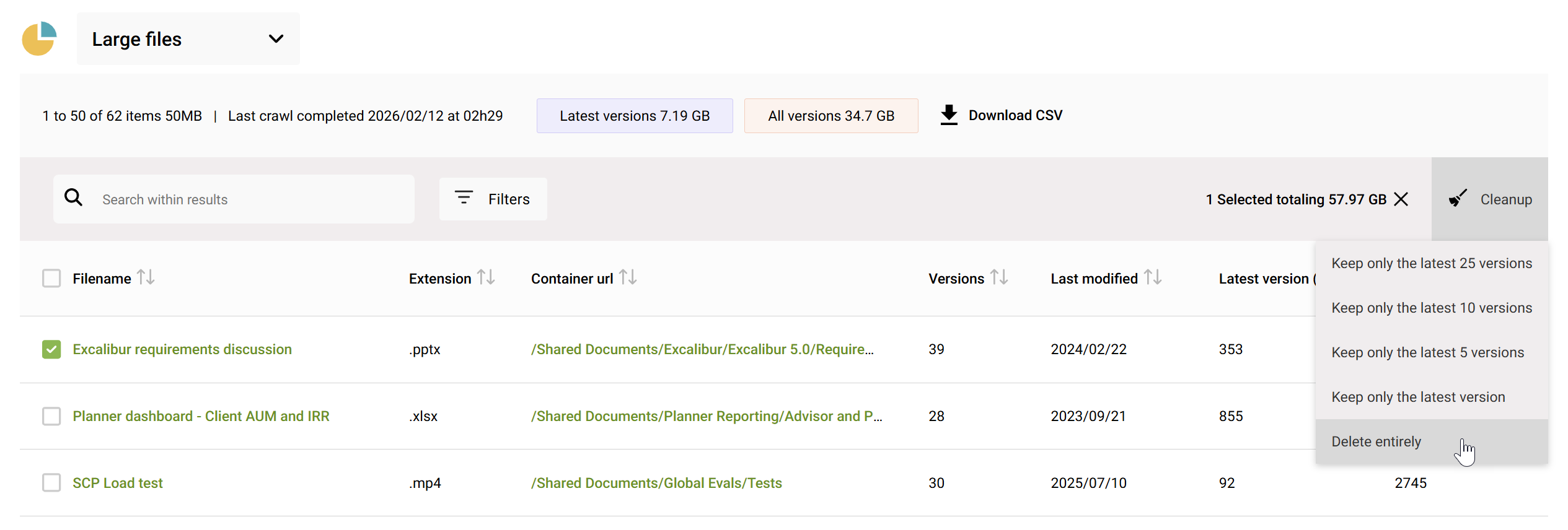 Often, you’ll discover outliers like huge video files, database backups, PSTs, or other heavy content that might be better stored elsewhere (or not at all). If you've identified files which should not be in the site at all, you can directly select and delete them using the Cleanup > Delete entirely action in the toolbar.